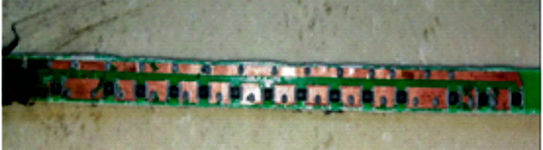 排查PCB板是否存在短路,需要暴露出PCB板布線面,經環氧樹脂溶解劑浸泡后的PCB板如圖3所示,焊點光滑牢固,且未見連焊現象,可以排除PCB板短路問題。由于溶解劑對干簧管玻璃有腐蝕作用,經浸泡后的干簧管已損壞。