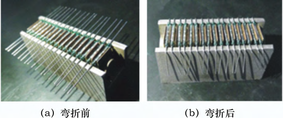 干簧管焊接前需要將其管腳由直線型彎折90°,管腳彎折后插入PCB板孔焊接,管腳彎折前后狀態如圖4所示。彎折管腳一般使用專用工裝,工裝上有凹槽并帶有磁性,可以防止彎折管腳時干簧管錯動,避免彎角時損壞干簧管,即使干簧管損壞,在焊接后檢測時也會被發現。在生產現場排查時,隨機彎折了一批干簧管,經測試,干簧管性能達標。