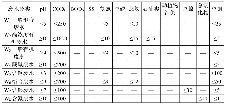 根據(jù)工藝特征將生產(chǎn)廢水分為八類:一般混合廢水(W1)、高濃度有機(jī)廢水(W2)、一般有機(jī)廢水(W3)、酸堿廢水(W4)、含銅廢水(W5)、絡(luò)合廢水(W6)、含鎳廢水(W7)、含氰廢水(W8)。各類廢