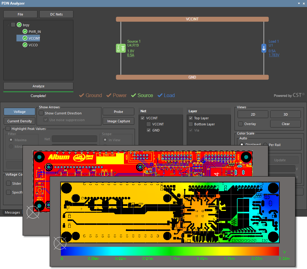 在電力傳輸和熱管理方面,使用電力傳輸網絡分析儀(PDNA)可以確定整個走線,電源和接地層以及過孔的IR損耗。您的PDNA應使用直觀的輸出格式產生電壓和電流密度結果。最好的工具將向您顯示交互式彩色地圖,使您可以直觀地檢查您的電路板是否存在潛在的電源熱問題和過多的IR壓降。